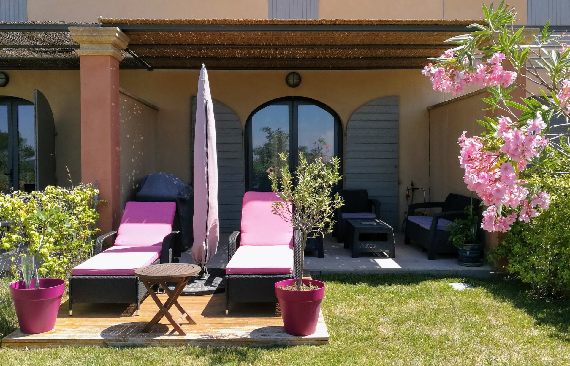 Côté sud, une terrasse sous pergola prolongée d'une terrasse en bois, un jardin.