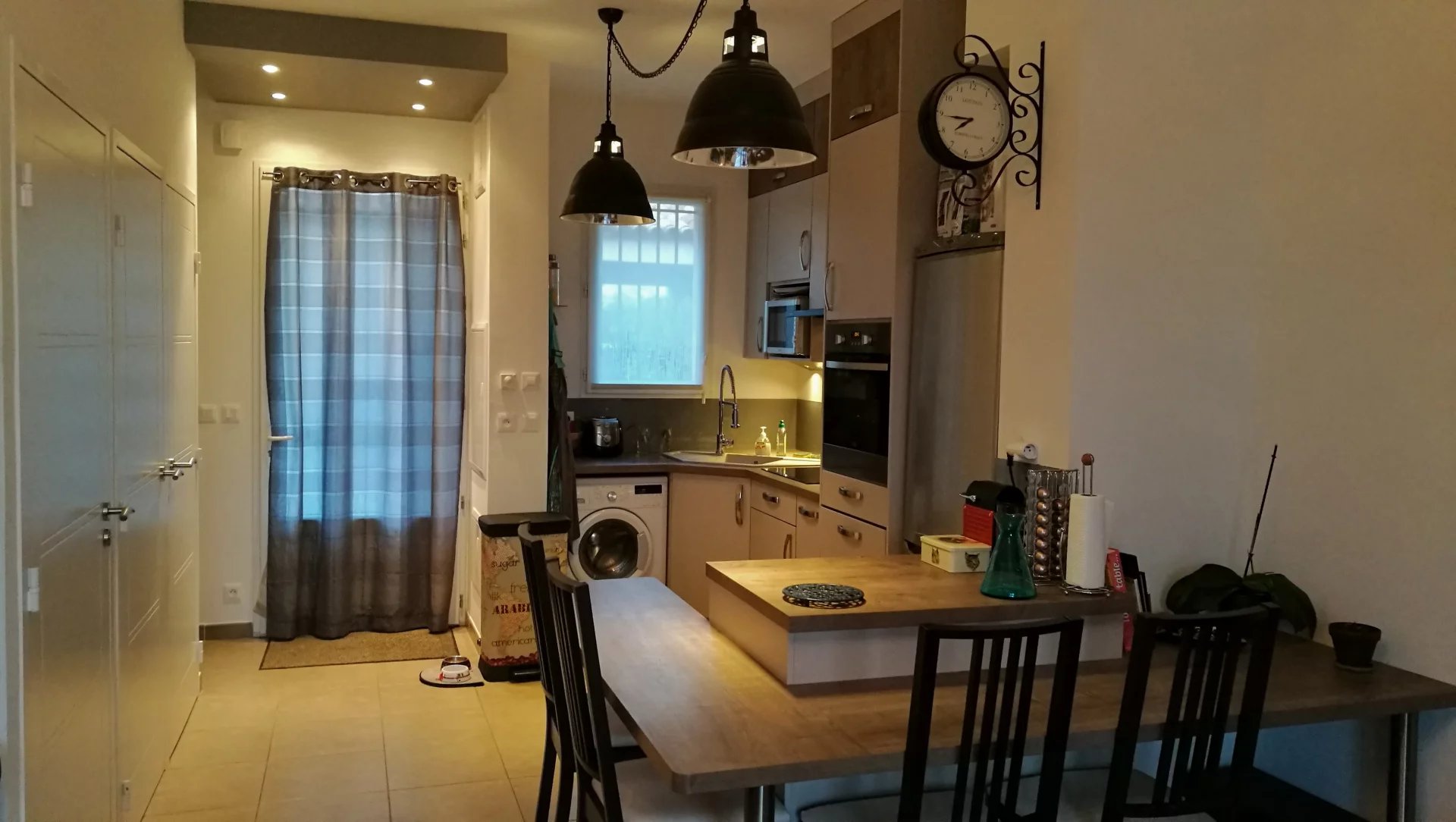 Au rez de chaussée une pièce à vivre de 32m2 traversante, orientée nord-est (entrée) / sud-ouest (terrasse/jardin) comprenant une cuisine ouverte, table à manger et salon spacieux.